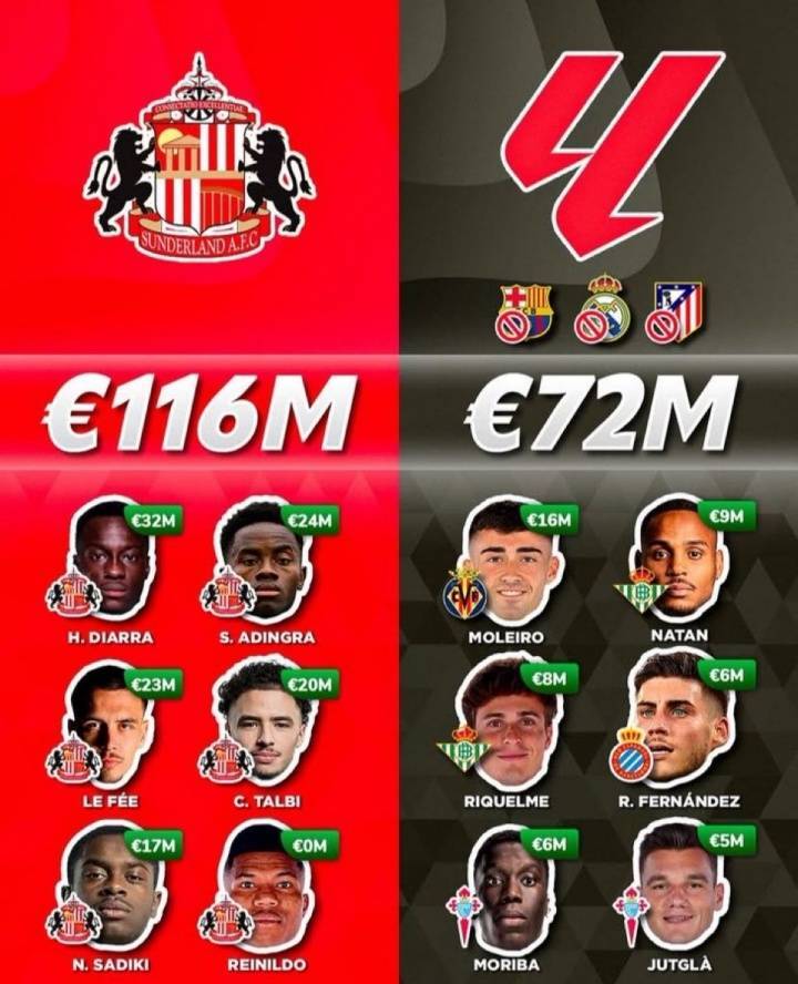 据外媒统计,桑德兰今夏已经支出1.16亿欧(已官宣转会),这一数字甚至超过了西甲除皇萨竞之外,其余17队的总和,17支球队总支出目前仅为7200万欧。